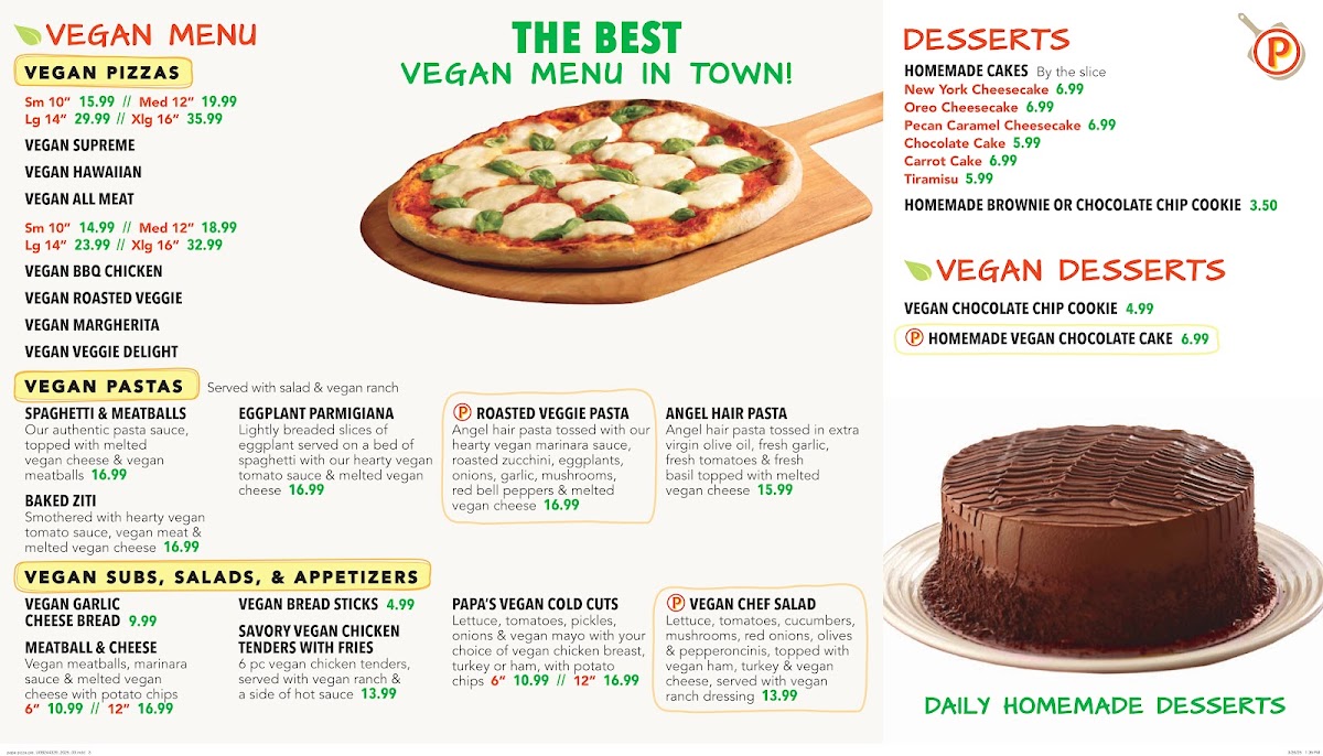 At Papa Pizza Pie, the magic begins with their extensive menu that goes beyond ordinary pizzas. Their offerings include hearty sandwiches, crisp salads, comforting soups, and an impressive selection of wings and pastas. For the vegan crowd, indulge in their delightful Homemade Vegan Chocolate Cake priced at just $6.99 or the Vegan Chocolate Chip Cookie for a sweet treat at $3.99. The freshness and quality of the ingredients shine through in every dish, ensuring you're not just satisfied, but truly delighted.